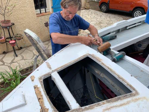 Mais nous devons continuer le travail sur la timonerie. Le décapage et le ponçage des multiples couches de vernis ne sont pas simples et prennent beaucoup de temps. |