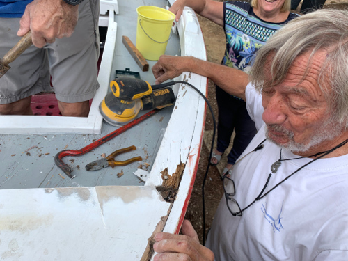 Le carénage se tranforme en chantier de restauration mais sans avoird'atelier. Travailler dehors est beaucoup plus long et fastidieux. Et comme on ne rajeunit pas, c'est un chantier difficile. |
