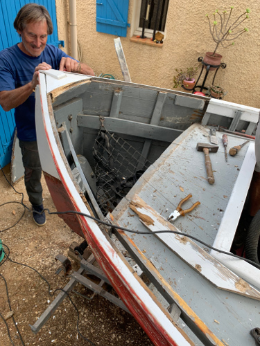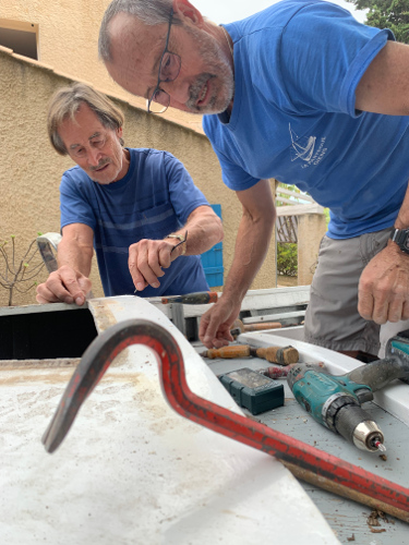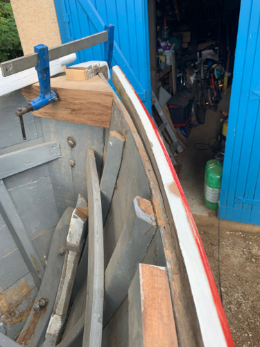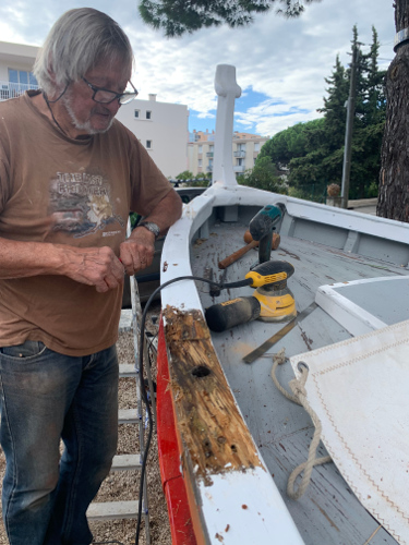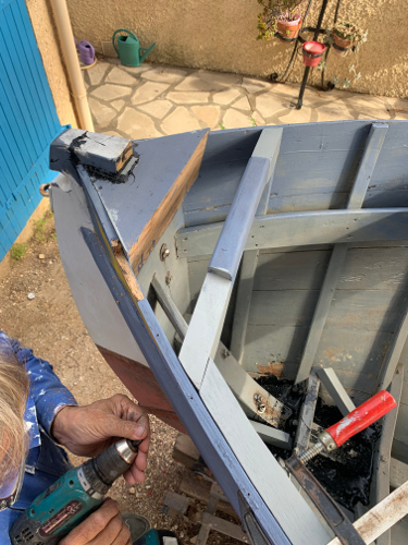Patrice fixe le nouveau barrot qui sert également pour passer les amarres et les renforts pour reconstruire toute la poupe. |