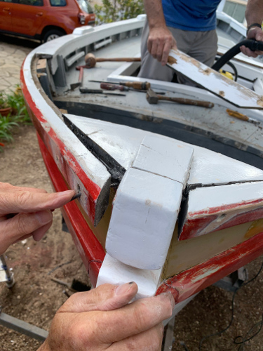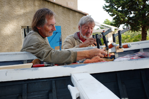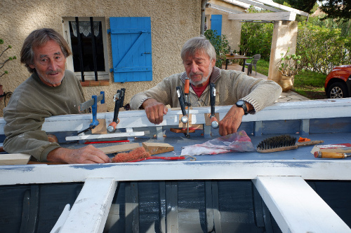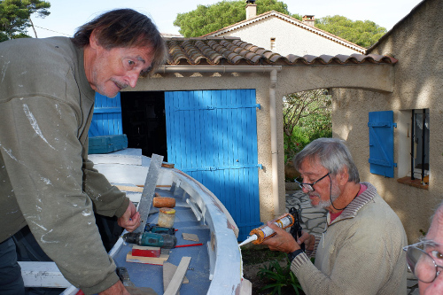 Jean Pierre intervient par l'intérieur et Patrice fabrique des pièces de bois pour réduire la largeur de la rablure (espace entre le galbord et la quille). |