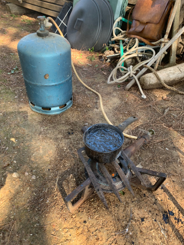 Jean Pierre prépare une bonne potion magique. Il a décidé de couler du brai dans la poupe, pour assainir les fonds entre les dernières varangues. |