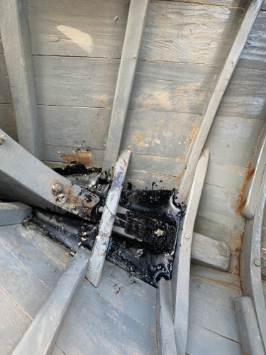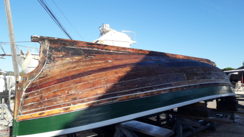 Dans la foulée, la coque a été poncée au bois. Il faut maintenant que le bois qui est à l'eau depuis 88 ans sèche pour pouvoir passer à la phase suivante. Cela va prendre plusieurs semaines voir plusieurs mois. |