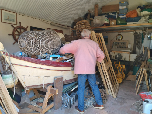 La préparation se passe dans l'atelier de Manu. Il sort toutes les maquettes de son père et nous les montons sur les supports. René était très organisé. Tout est étiqueté et Manu a été pêcheur professionnel, ce qui est précieux pour positionner chaque filet. |