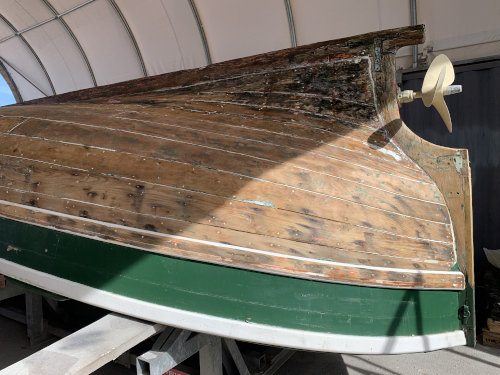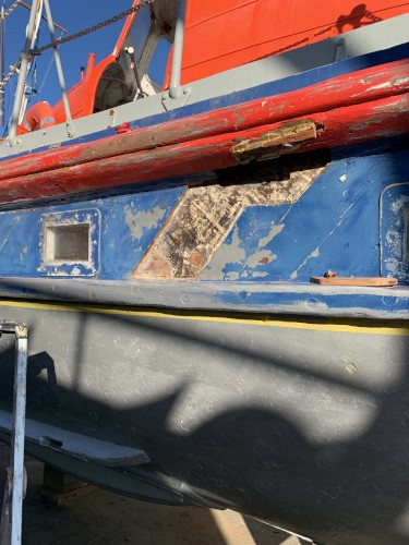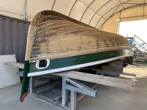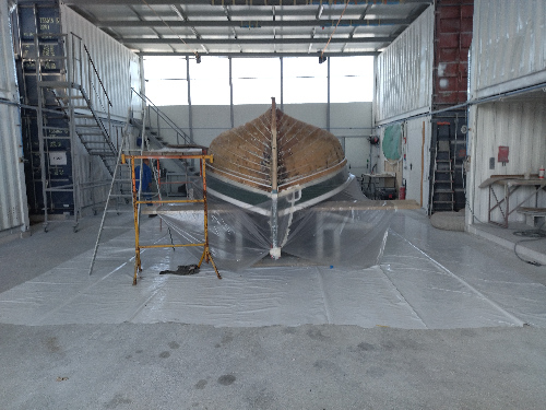 La coque est réparée et le côté babord a reçu aussi ses deux couches de peinture. |