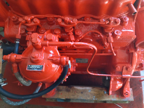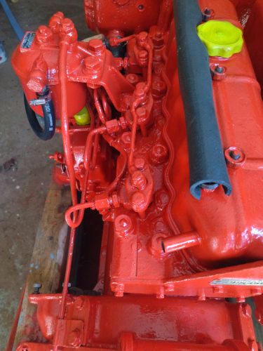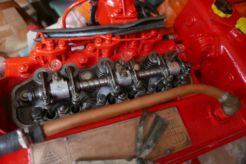 C'est fini, quelques touches de couleur pour identifier les circuits eau et huile. La rampe de graissage des culbuteurs que nous devons huiler avant chaque démarrage est en place avec sa protection caoutchouc maison. |