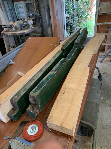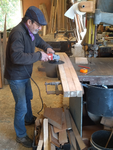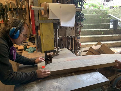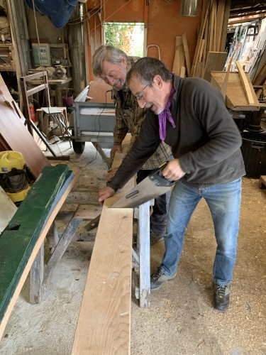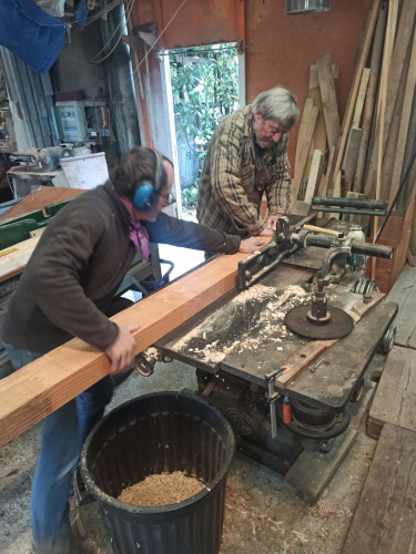 On tape dans la réserve de bois de Manu car on ne sait pas combien il va nous falloir d'argent pour terminer le Liberté. On coupe, on rabote... |
