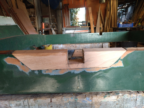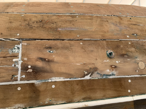 Tiens, l'eau et les années ont fait leur travail. Cette partie est très abîmée. Les planches d'acajou sont pourries. Heureusement le second pli est presque correct. Patrice se charge de la réparation mais nous n'avons que trois jours devant nous. |