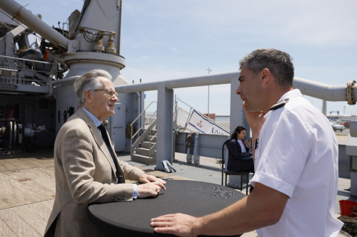 Le Capitaine de la Loire et son équipage nous ont réservé un accueil des plus chaleureux. Escale à Sète a invité sur le pont du bateau tout l'équipage à un cocktail de l'amitié et de la solidarité. La Loire arrivait de mission, a fait une escale de 4 jours à Sète et reprenait la mer le lendemain pour une nouvelle mission. La Marine Nationale sera présente à Escale à Sète 2026 pour ses 400 ans. Le Consul Honoraire de Pologne qui discute avec le Capitaine a voulu rencontrer la Partègue pour nous remercier de la belle exposition sur Joseph Conrad que nous avions réalisée à Sète. Le fait d'avoir mis à l'honneur cet immense écrivain, ce grand marin, sa philosophie, et le cercle conradien qui perpétue les valeurs des gens de mer l'a grandement intéressé. Lorsque je lui ai dit qu'en 2023 nous avons évoqué Joseph Conrad dans notre grande exposition du salin des Pesquiers et que les touristes polonais s'étaient fait photographier avec nous et le dernier roman de Conrad qui se passe sur la presqu'ile de Giens, il était très heureux et nous nous reverrons a-t-il dit ...pour un autre projet ? |