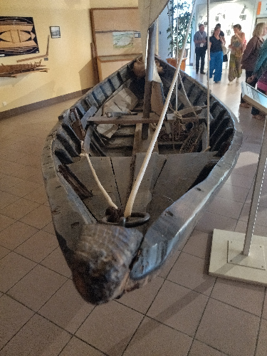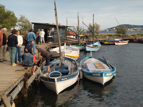 A côté du musée, une extension constituée d'un ponton, d'un cabanon et de bateaux d'intérêt patrimonial liés au Musée. Marie-Christine discute avec Christian Dorques (en bleu) que nous connaissons depuis 25 ans. Ils ont l'autorisation de travailler sur la pointe qui leur est dédiée en mettant une bâche sur le sol lorsqu'ils font des travaux "salissants". Simple, efficace mais non autorisé chez nous. Les bateaux sont les plus authentiques possibles comme ceux de la Partègue. Certains sont en restauration et on a revu " Bise Aigüe" la barquette réalisée par les compagnons du devoir sur des plans de Ruopolo. Bref nous étions un peu chez nous. |