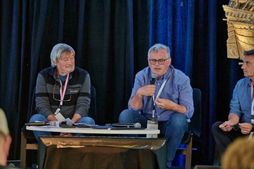 C 'est aussi le moment de formaliser les relations entre pays et acteurs du patrimoine. Les prises de paroles se suivent et apportent du bohneur, de l'envie , de la vie. Sur cette photo Wolgang Directeur d'Escale à Sète, à ses côtés depuis le début Raymond gardien de la qualité de la manifestation et membre de la Partègue depuis 25 ans. Derrière Henry Masson rédacteur de la Mission ministérielle dédiée au patrimone maritime. |