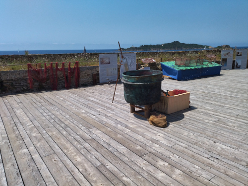 Le lendemain matin, le chaudron avec son robinet est présenté sur la terrasse du Pradeau pour l'événement "A l'assaut du Pradeau" organisé par Cécile du Parc National de Port Cros les 6 et 7 juin 2025. |