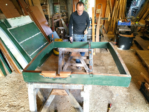 Les panneaux du Liberté ont, eux aussi, 25 ans et il y a de gros travaux de restauration. Pas de place dans l'atelier. Manu nous héberge dans son atelier alors qu'il a besoin d'espace pour des travaux personnels. On va trouver une solution. |